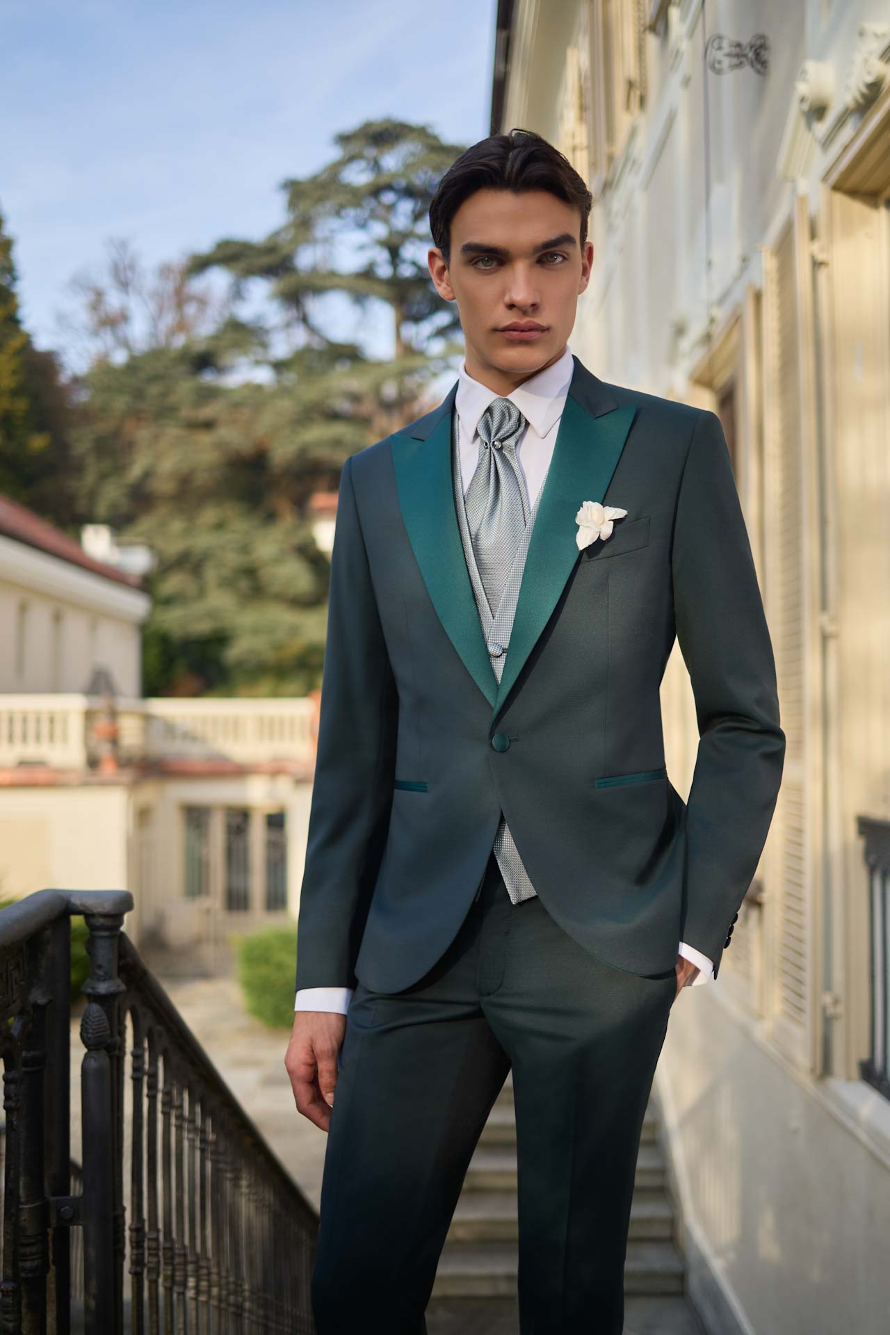 SMOKING DOPPIOPETTO COLLO SCIALLATO IN CHIAVE NERA, CON TASCHE E BOTTONI IN RASO CHE RICHIAMOANO IL REVER. DISPONIBILE ANCHE IN VARIANTE BLU’.