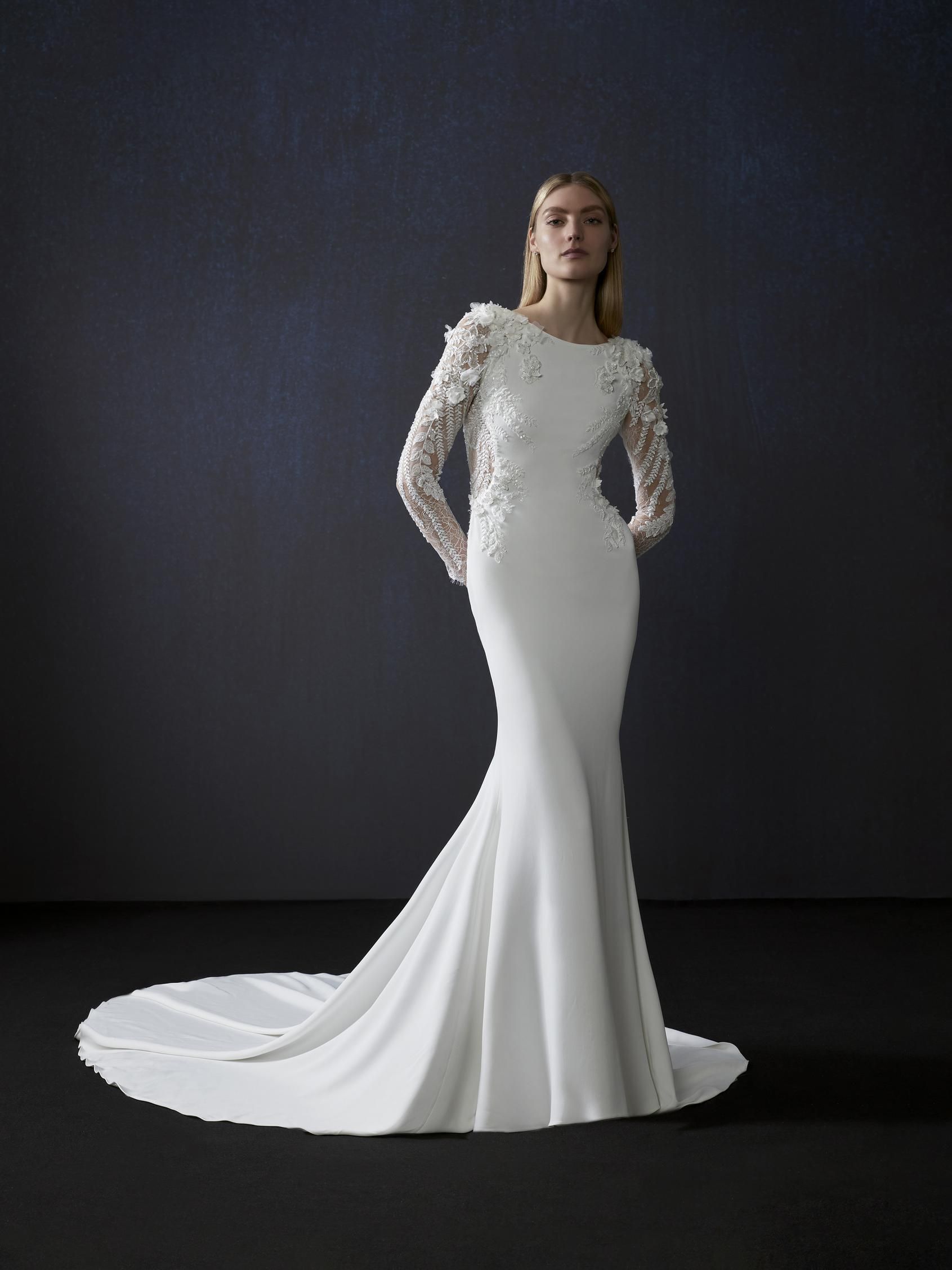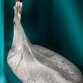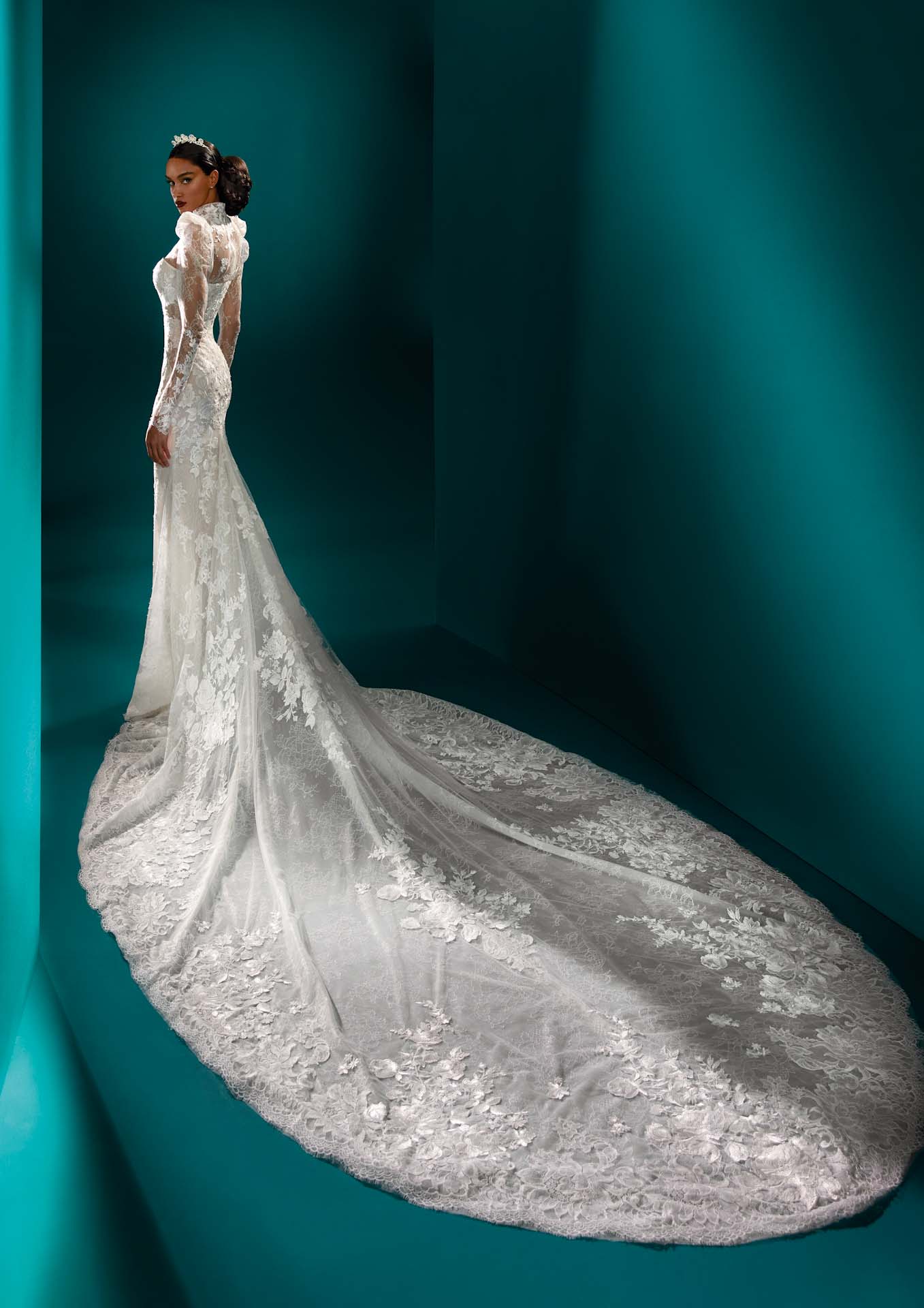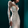 Meraviglioso abito a sirena con effetto multistrato in pizzo e chantilly. Un design con coda e corpo staccabili che crea un effetto due in uno, ideale per creare due look. La sensualità delle trasparenze nelle lunghe maniche a sbuffo e nel body, dal collo alto, si fonde con la femminilità dello scollo a cuore. Un design molto sexy ed elegante allo stesso tempo.
