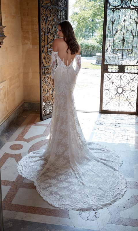 - Il nostro abito da sposa firmato Paula ha una vestibilità glamour e redingote svasata in romantico pizzo Chantilly con applicazioni di pizzo delicatamente decorato. Il corpetto del corsetto ha uno scollo a cuore senza spalline con una scollatura sexy e una schiena trasparente che rivela la stecca couture. Lo strascico trasparente a petali mette in risalto il delizioso motivo floreale del pizzo con un orlo smerlato per una maggiore consistenza. Abbina l’abito alle maniche a guanto staccabili abbinate per cambiare look. Presentato in avorio/champagne/miele.