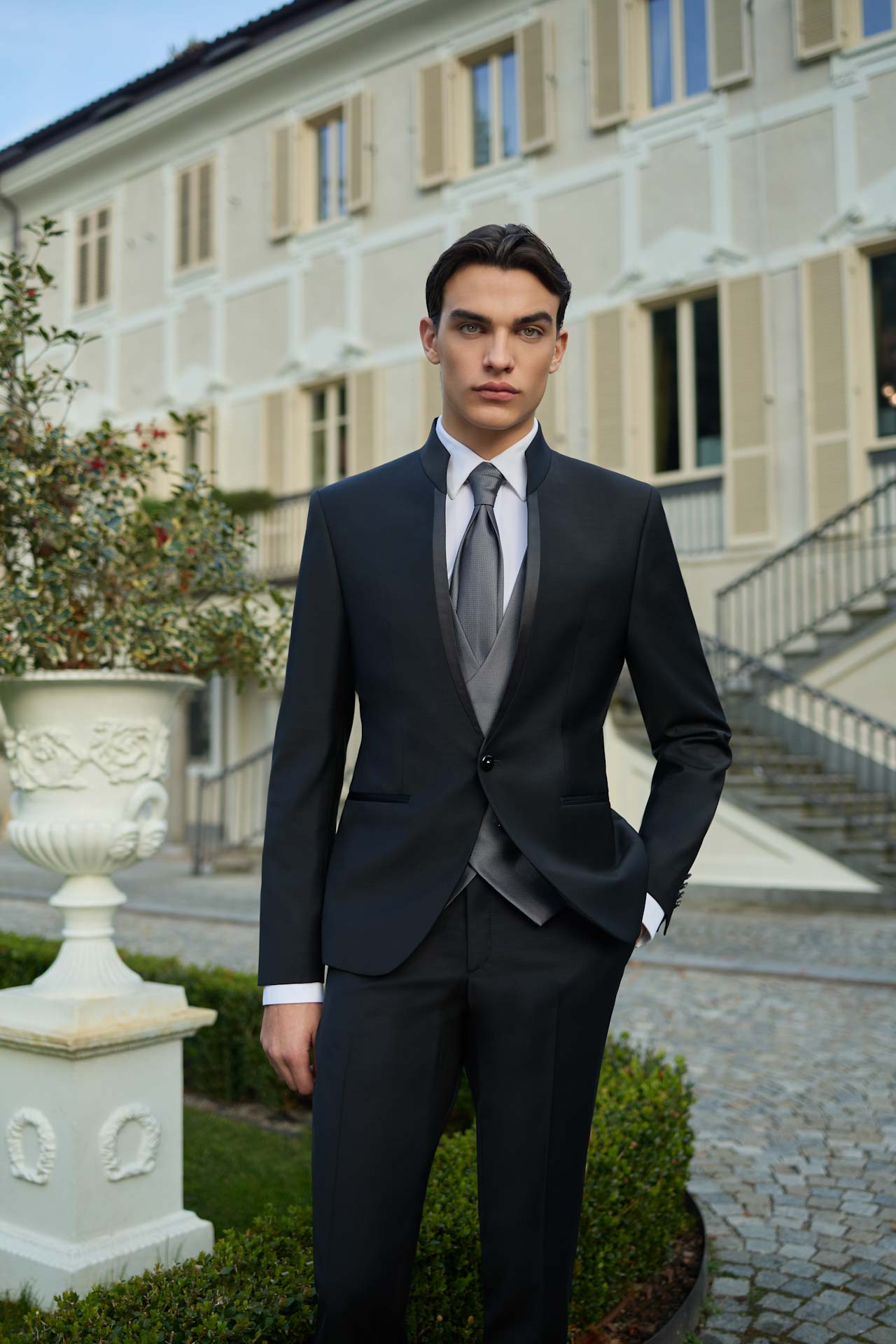 SMOKING COLLO A LANCIA IN CHIAVE VERDE SALVIA, CON TASCHE E BOTTONI IN RASO CHE RICHIAMOANO IL REVER.